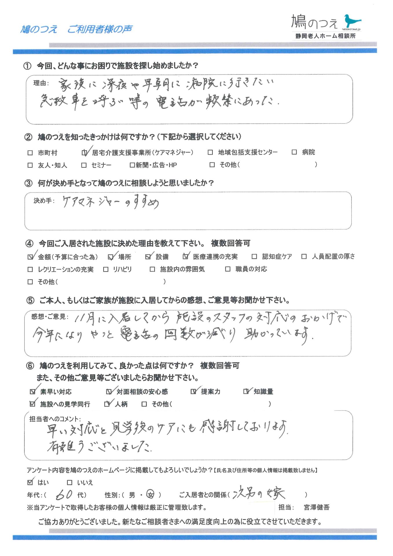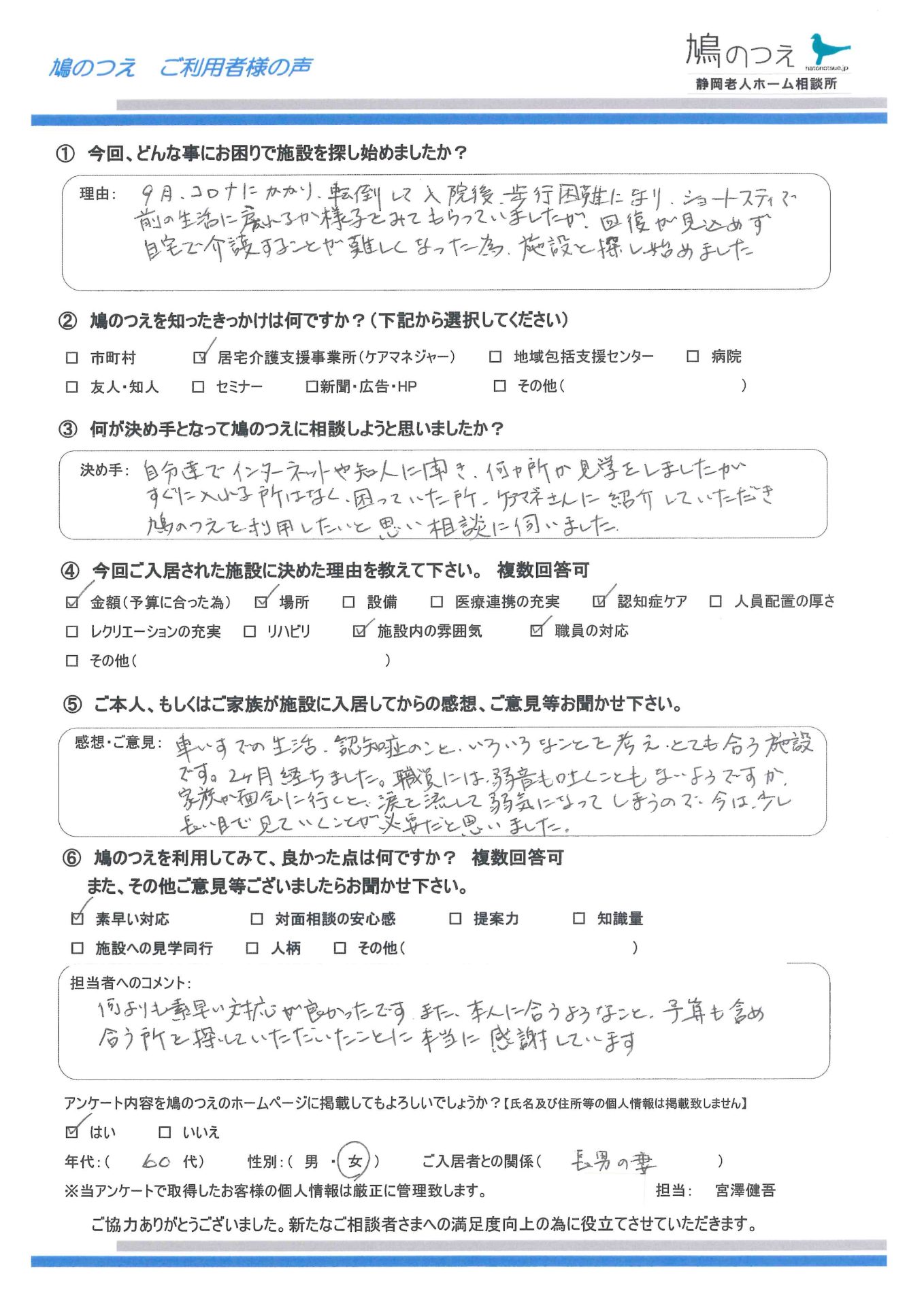 富士市内の居宅のケアマネジャーさんからご依頼があり、長女様が鳩のつえに相談にいらっしゃいました。 94歳、要介護4、お母様の入居施設を探した ...