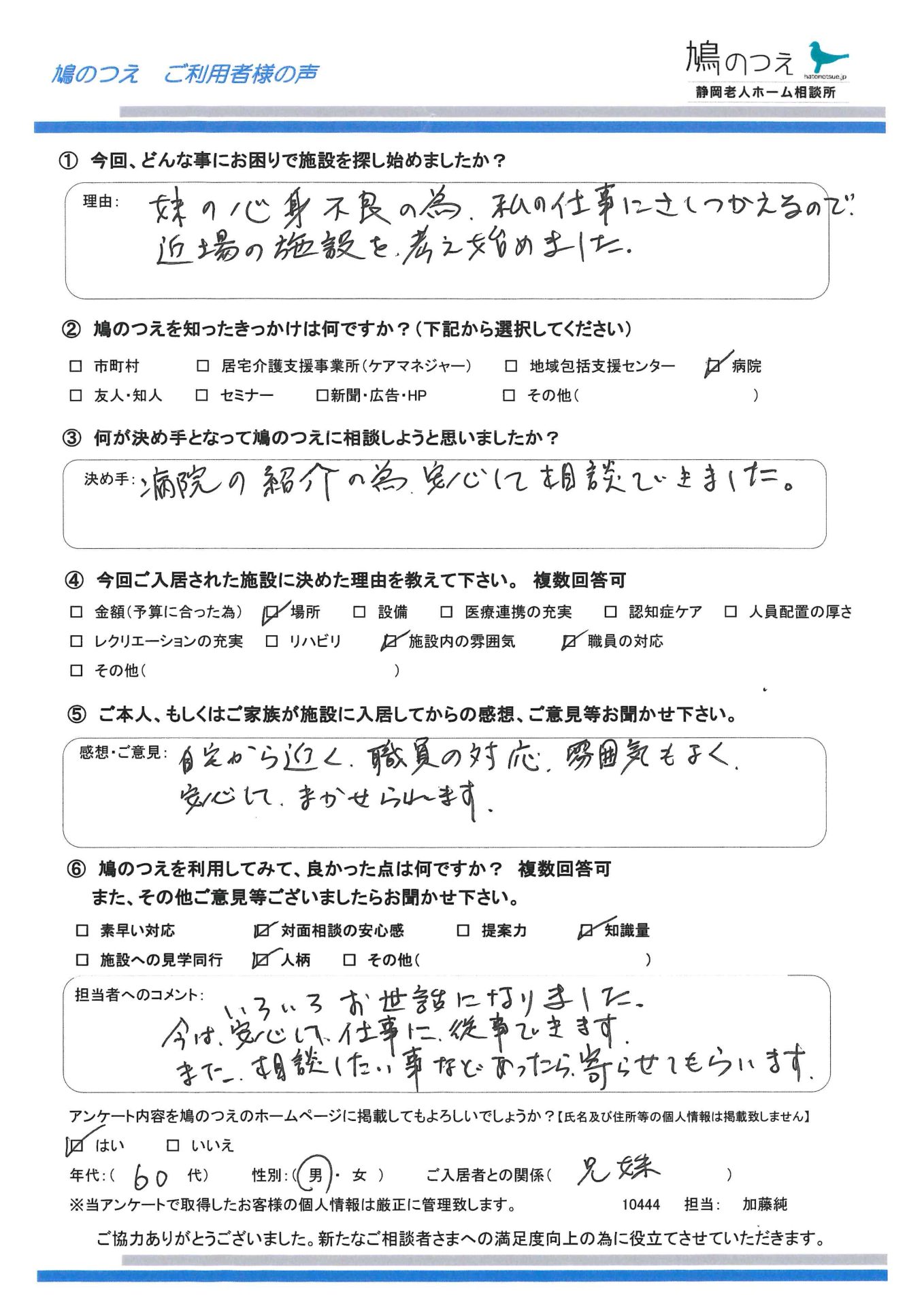 病院からのご紹介で鳩のつえに息子様よりご相談あり。 入院中のお母様について施設入居を検討しているとのこと。 アン ...