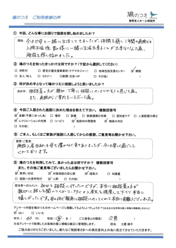 病院からのご紹介で鳩のつえに息子様よりご相談あり。