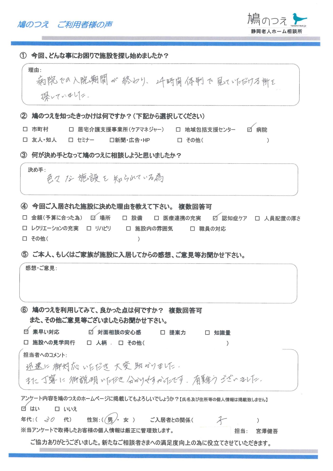 施設側にもご協力をいただき、早めの本人面談、早めの受け入れで、ご相談から約1ヶ月でご入居に至る事ができました。忙しい所アンケートにご協力頂き、ありがとうございました。