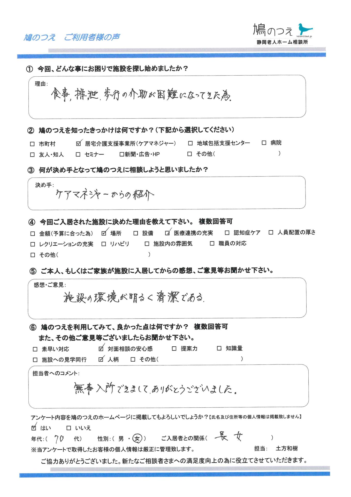 富士市内の住宅型有料老人ホームを2件見学しましたが、入居後も自宅から面会に通いやすい施設で入居をご希望。看護師が24時間常駐している安心感も決め手となりました。