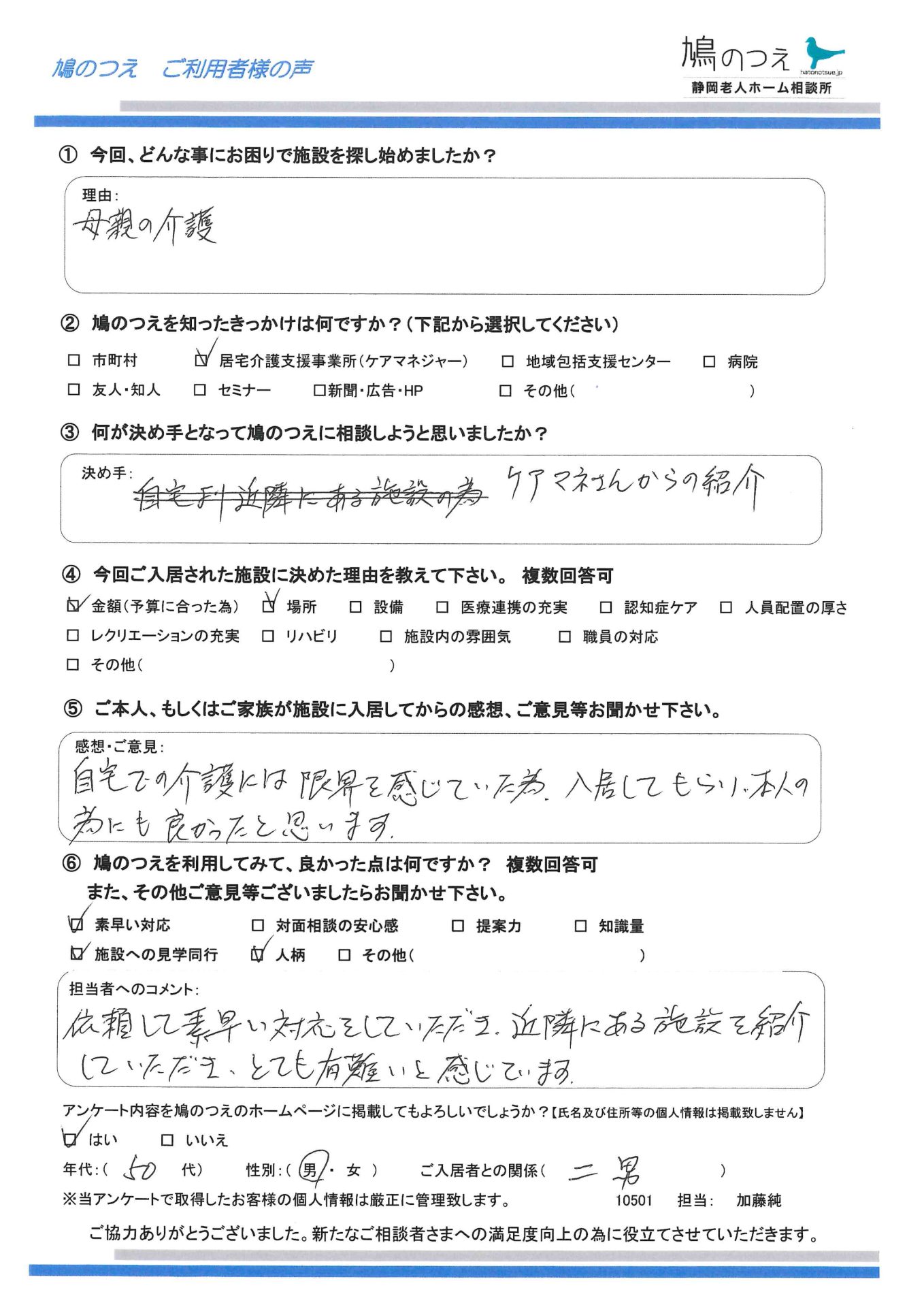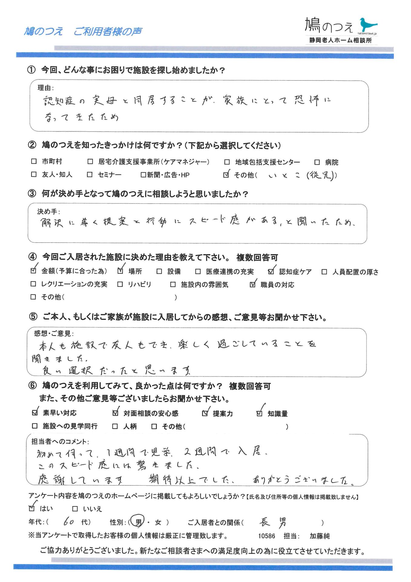 十分に話を聴いていただき、お陰様で納得のいく選択をすることができました。施設を利用する者にとって、偏りのない客観的な情報は一番必要なものだと思います。鳩のつえが良き羅針盤としてますます発展されることを願っています。ありがとうございました。